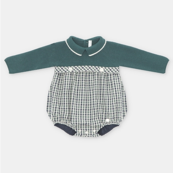 Este Pelele, con su suave lana verde botella y tela estampada de bambula a cuadros, es perfecto para esos momentos únicos en los que se busca elegancia y confort.